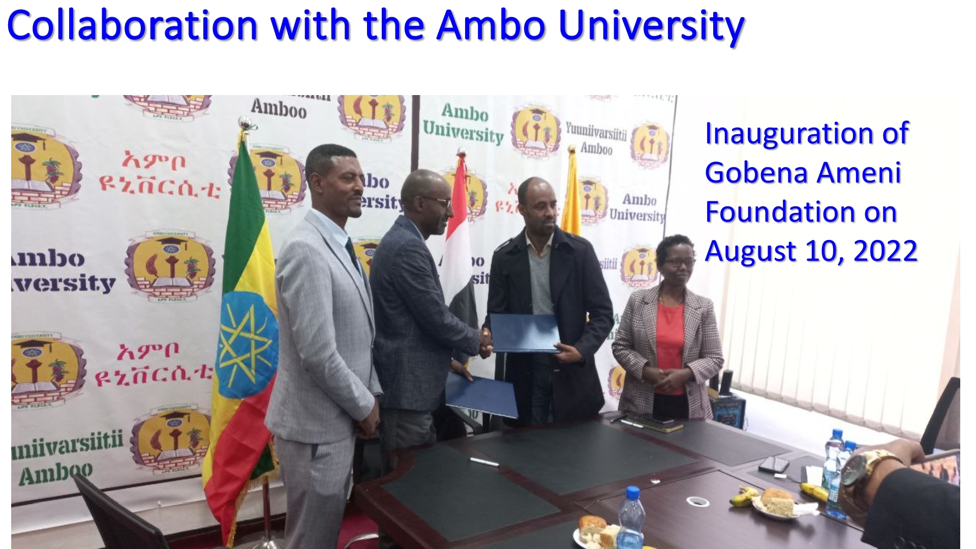 We have established the Gobena Ameni Fondation in order to promote education, research and innovation in medical and agricultural sciences in Ethiopia. Specifically, at its present stage, the Foundation awards scholarship to 10 best performing undergraduate students of the Ambo University on yearly basis in order to promote academic excellence.
